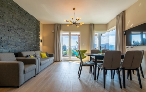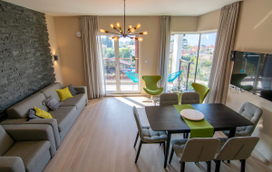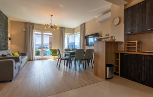 The apartment includes large living room, kitchen with dining area, 2 bedrooms, bathroom and terrace overlooking over the sea. The apartment is bright with large panoramic windows.