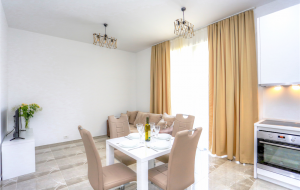 The apartment is located on the first floor and has living room with kitchen and dining area, two bedrooms, a bathroom, guest toilet, and spacious terrace. The terrace can be accessed both from living room and one of the bedrooms, it has panoramic view of Budva marina.