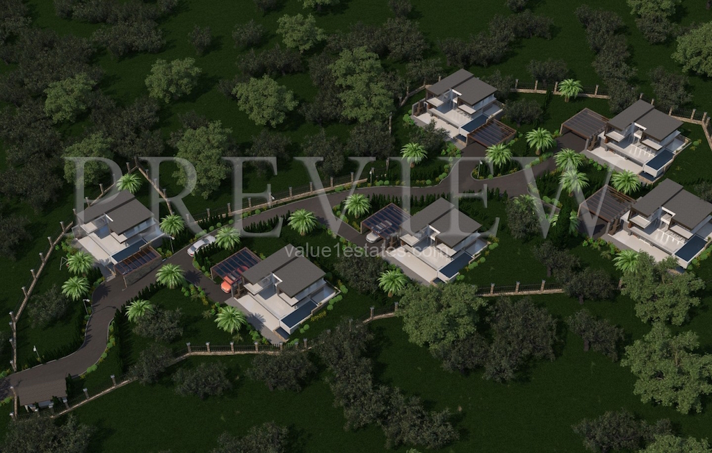 The complex is located on the fenced and secured territory. The project includes 6 independent villas with swimming pool and parking space, each standing on its own land plot of 500 m2.