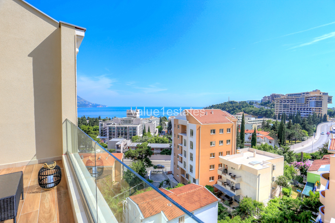 Two-bedroom penthouse in the new condo complex with underground parking in Bečići. Thanks to thoughtful design of the building all terraces and windows of the apartments have astonishing sea view.