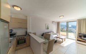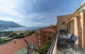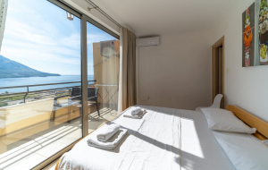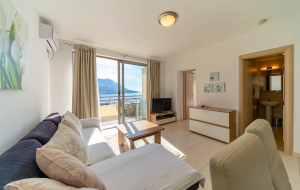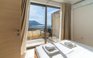 The apartment is located on the third level and has entrance hallway, living room with kitchen and dining area, two bedrooms, two bathrooms and large double balcony with great panoramic sea and mountains view.