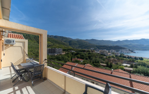 Fully furnished 2-bedroom apartment with huge terrace offering panoramic sea and mountain view in the residential complex with swimming pool in Becici, resort town near Budva.
