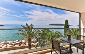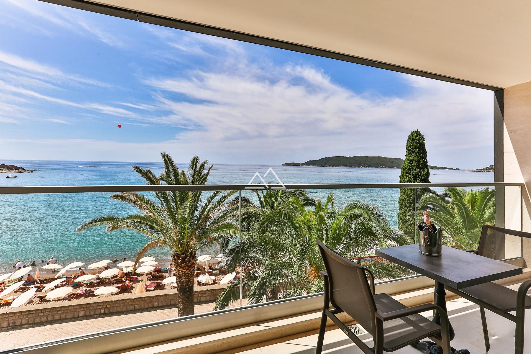 New modern condo-hotel on the waterfront. Condo-hotel is modern development project, comfortably located in Rafailovici at the Budva Riviera - the most developed and attractive tourist destination in Montenegro. Apartments are located directly on the coast of the Adriatic Sea and on the 2 km long sandy Becici beach, which many consider the most beautiful beach in Montenegro. In Paris in 1935 Becici beach received Grand prix and was acknowledged as most beautiful beach in Europe, thirty years later it received Golden palm for most beautiful beach in Mediterranean. Project is connected with the Old Town of Budva by a promenade that goes directly by the sea in the length of 5km, it can be reached in less than 10 minutes by transport. On the other hand, the complex is 4 km far from the famous St. Stefan and it 5 minutes far by transport. Accommodation in the apartments provides unique experience to the owners and guests: view on a sandy beach, crystal clear sea, magnificent mountain peaks and the largest island in Montenegro called Sveti Nikola.