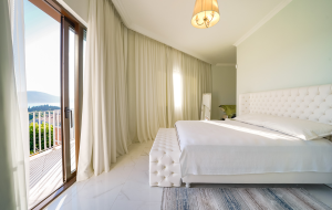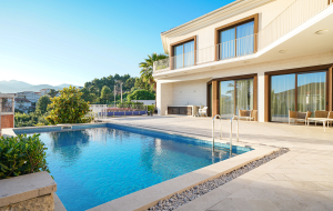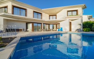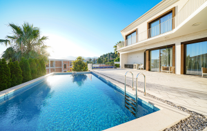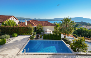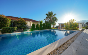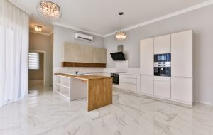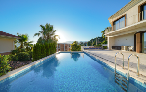 The villa is sold with furniture, installed Mitsubishi underfloor heating and air conditioning systems, Italian kitchen with Bosch appliances, and equipped wardrobes. A surveillance system is installed. The villa building is constructed in a traditional Mediterranean style.