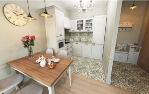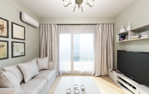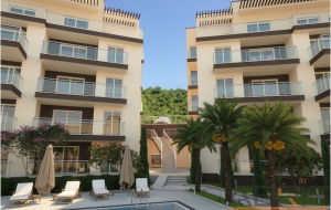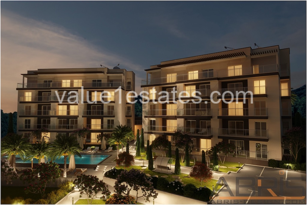 The area of one-bedroom apartment is 60.90 m2. The apartment has a living room with a kitchen area, one bedroom, a bathroom and a terrace with sea views.