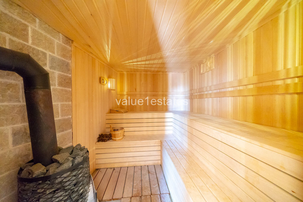 On the 1st floor of the villa there is a large living room with fireplace, a kitchen with a dining area, a large bathroom. Also adjacent to the house is an auxiliary building, in which a sauna is located.