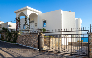 The main entrance of the villa is located on the third floor due to features. Entering the building, you immediately find yourself in a huge kitchen-dining room and living room with fireplace. From here you can get to the spacious terrace, which offers a fantastic panoramic view of the sea. Bedrooms are located on all floors, six of which have private terraces with sea views. There is also a special household room with a washing machine, a convenient ironing board, and shelving for storing bedding and towels. Satellite TV and Wi-Fi are included.