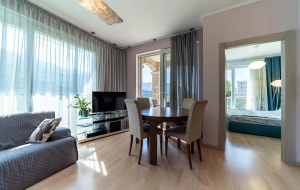 This fully furnished apartment is located on the ground floor of a club residential complex in a resort town of Becici, and has a private courtyard with an area of about 80 m2.
