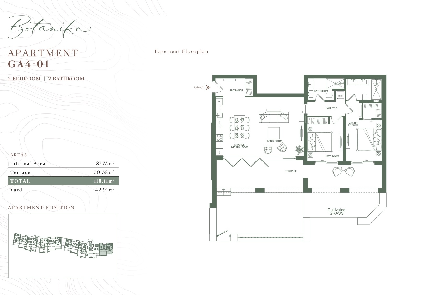 We offer for sale an apartment measuring 118 square meters with 2 bedrooms and a private courtyard of 43 sq.m.