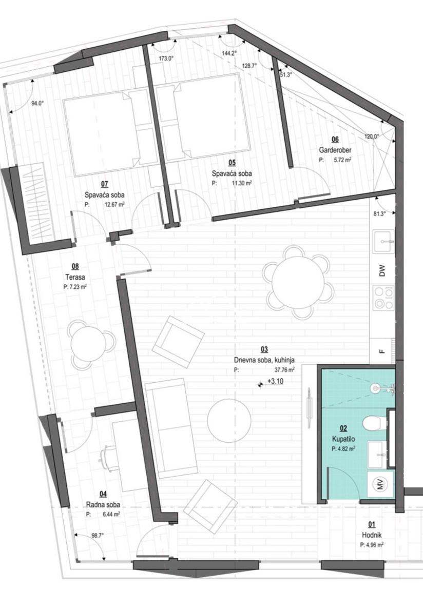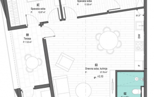 2-bedroom apartment with a dressing room in a new apartment building just 300 m from the Slovenska Plaza. The apartment consists of a living room combined with a kitchen, two bedrooms, a dressing room, a study /work room, a bathroom and a terrace.