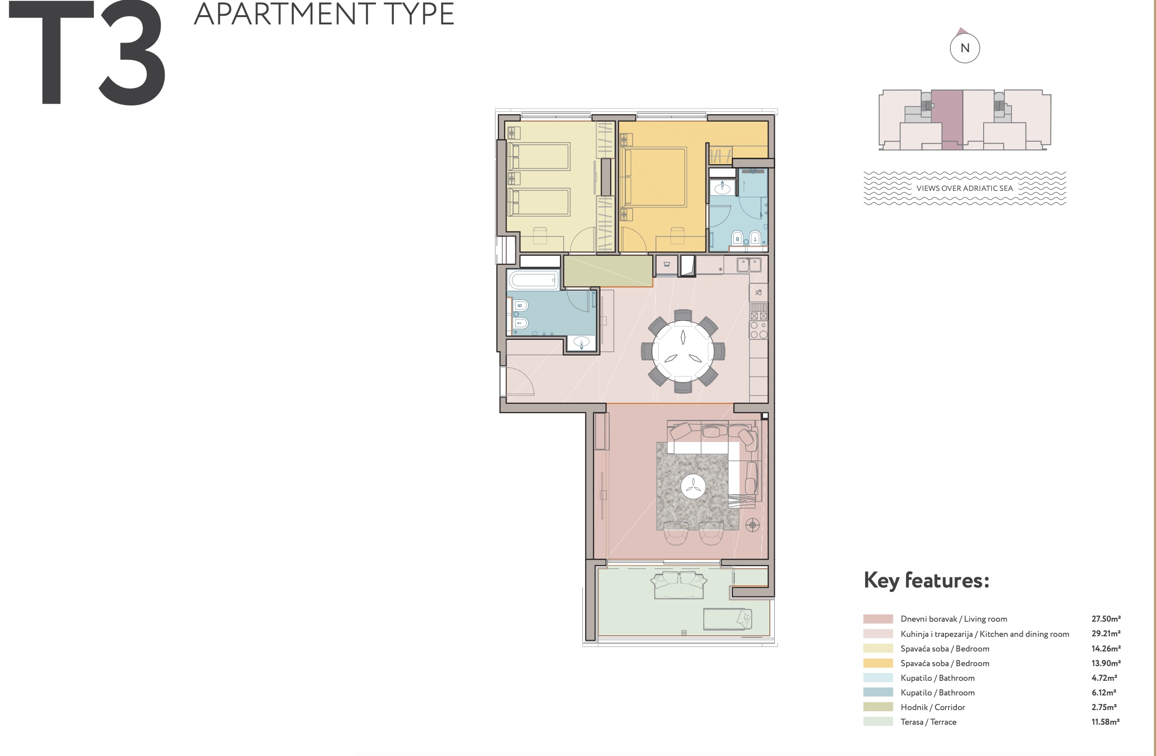 Apartments are located directly on the coast of the Adriatic Sea and on the 2 km long sandy Becici beach, which many consider the most beautiful beach in Montenegro. In Paris in 1935 Becici beach received Grand prix and was acknowledged as most beautiful beach in Europe, thirty years later it received Golden palm for most beautiful beach in Mediterranean. Project is connected with the Old Town of Budva by a promenade that goes directly by the sea in the length of 5km, it can be reached in less than 10 minutes by transport. On the other hand, the complex is 4 km far from the famous St. Stefan and it 5 minutes far by transport. Accommodation in the apartments provides unique experience to the owners and guests: view on a sandy beach, crystal clear sea, magnificent mountain peaks and the largest island in Montenegro called Sveti Nikola.