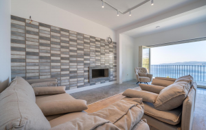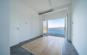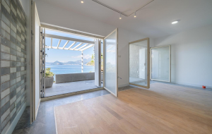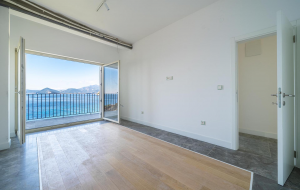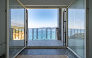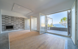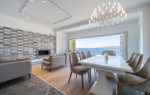On the middle level there is a large living room with kitchen and dining area, two spacious terraces with panoramic sea views, and a guest bathroom.