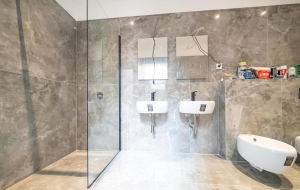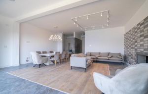 On the lower level there is a large bedroom with a dressing room and ensuite bathroom, a guest bedroom, 2 bathrooms, a home cinema, a gym, a sauna, a storage room and a technical room. The large bedroom and gym have direct access to the outdoor swimming pool (8x5m).