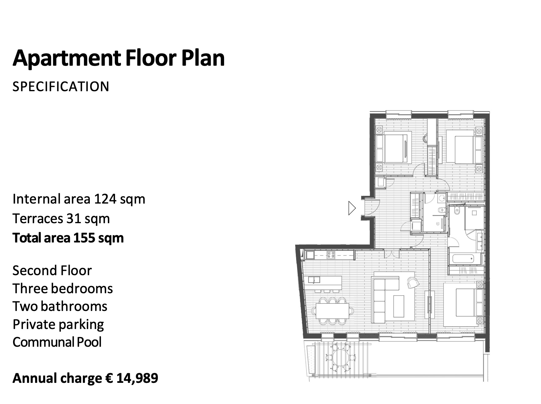 The apartment features a spacious living room, kitchen and dining area, two bedrooms, two bathrooms, and a terrace. Interior design blends elegant, light-filled spaces with modern functionality, creating a sense of refined and comfortable luxury.