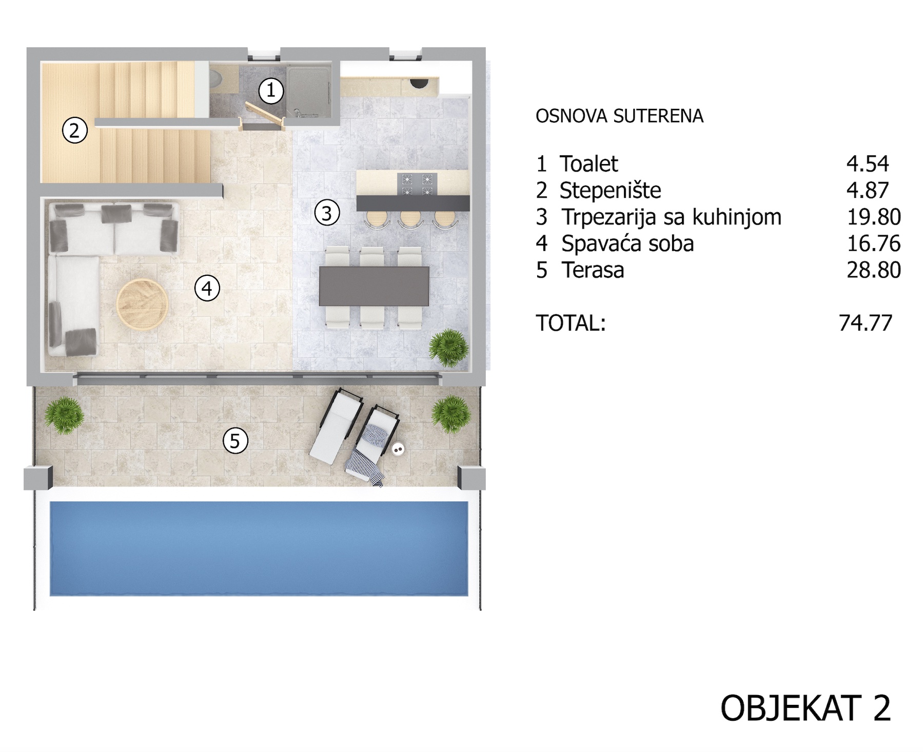 The villas are located 10 meters from the beach.The area of Villa 1 is 315 m2, the area of the plot is 450 m2.