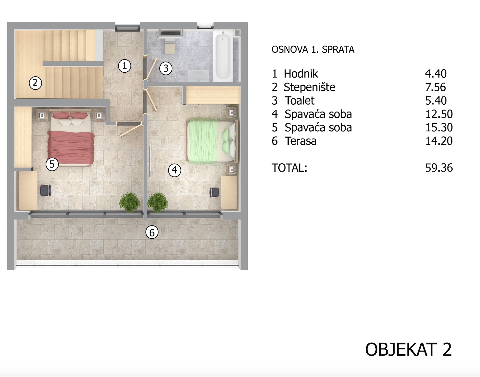 On the second floor there are two bedrooms with open terraces and a bathroom.