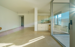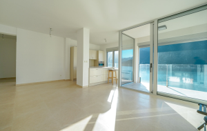 The apartment is located on the second floor of a new building. The apartment consists of a living room with a kitchen and a dining area with access to a terrace, two bedrooms, a bathroom and a corridor with stairs leading to a rooftop terrace with panoramic sea and mountain views.