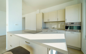 An elegant kitchen with a kitchen island is installed and fully equipped.