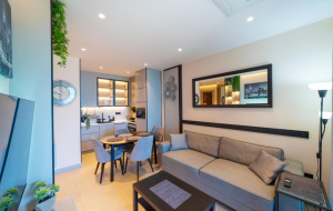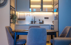 The apartment is located on the 2nd floor and consists of a hallway, a living room combined with a kitchen with access to a terrace, a bedroom, and a bathroom. The apartment is sold with a turnkey renovation, and custom design renovation is also possible. The interior decoration is done according to a design project using high-quality materials such as individually selected marble, designer wood, and stone solutions. The Legrand "Smart Home" system is installed.