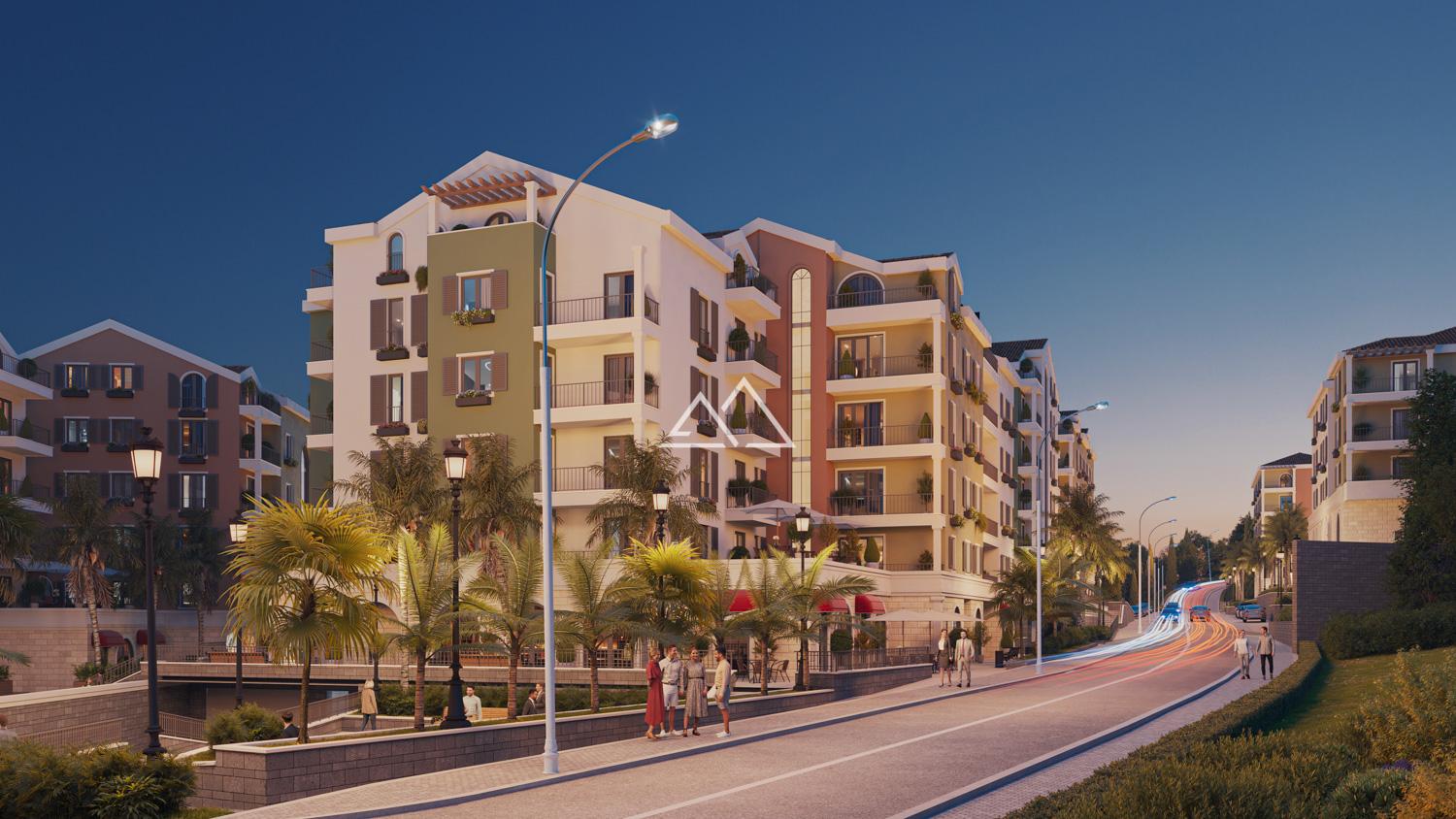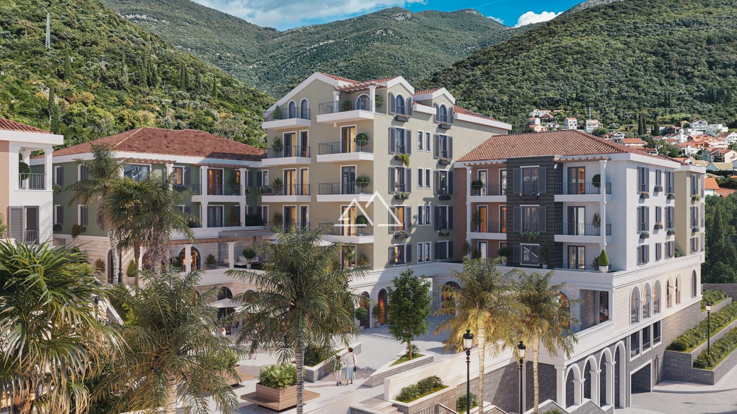 Two-bedroom apartment in a new multifunctional complex located in the prestigious area of Donja Lastva in Tivat. The complex is situated on a flat surface with easy access, only 550 meters from the seafront. The distance to Porto-Montenegro is 1.5 km. All necessary infrastructure for comfortable living and leisure is located nearby, as well as a 5-star hotel with fountains, a fitness center, and a SPA.