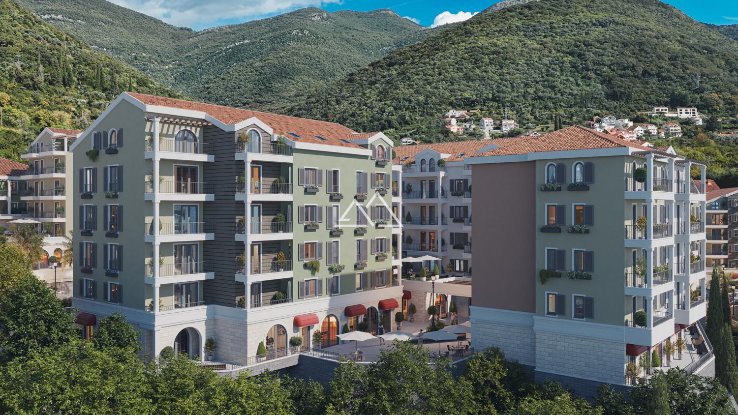 Three-bedroom apartment in a new multi-functional complex in the prestigious area of Tivat - Donja Lastva. The complex is located on a flat surface with easy access, 550m from the seafront. The distance to Porto Montenegro is 1.5km. The complex is surrounded by all the necessary infrastructure for a comfortable life and leisure, as well as a 5-star hotel with fountains, a fitness center, and a spa.