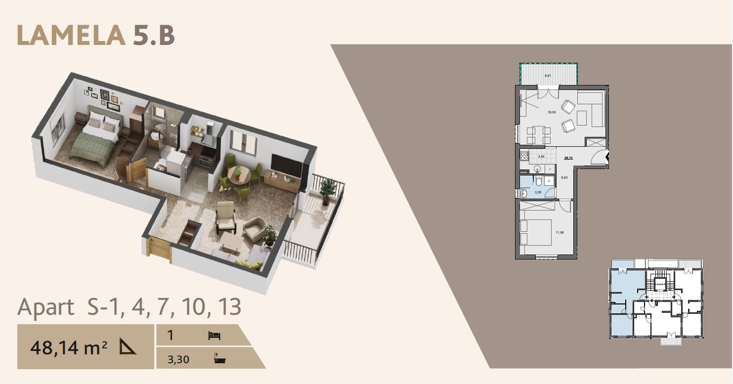 This apartment is sold with finishing and built-in plumbing fixtures and consist of a hallway, living room combined with a kitchen with access to the terrace, a bedroom, and a bathroom. During the construction phase, owners can realize their designer ideas and create comfortable and cozy living spaces that meet all their requirements and desires.