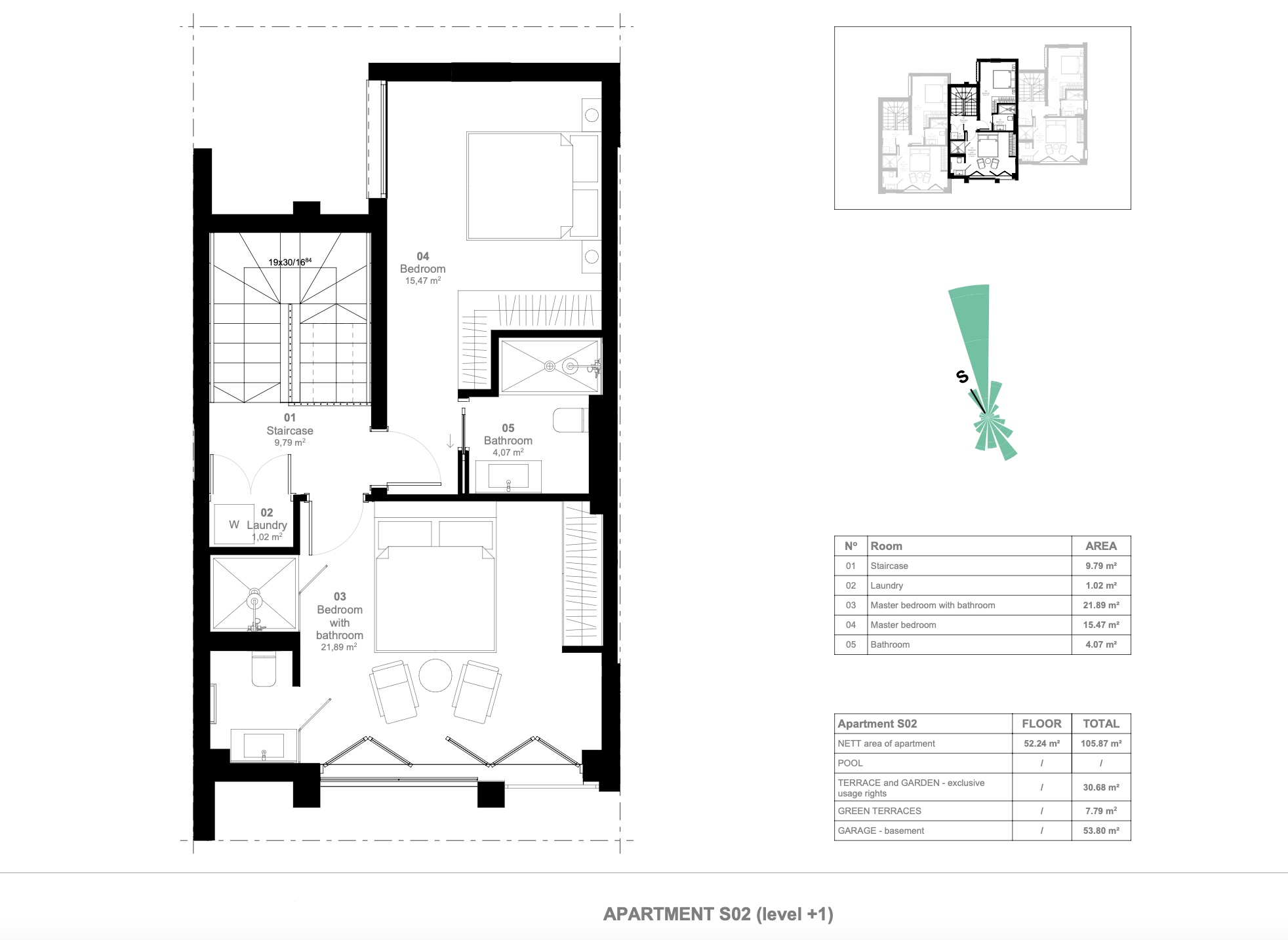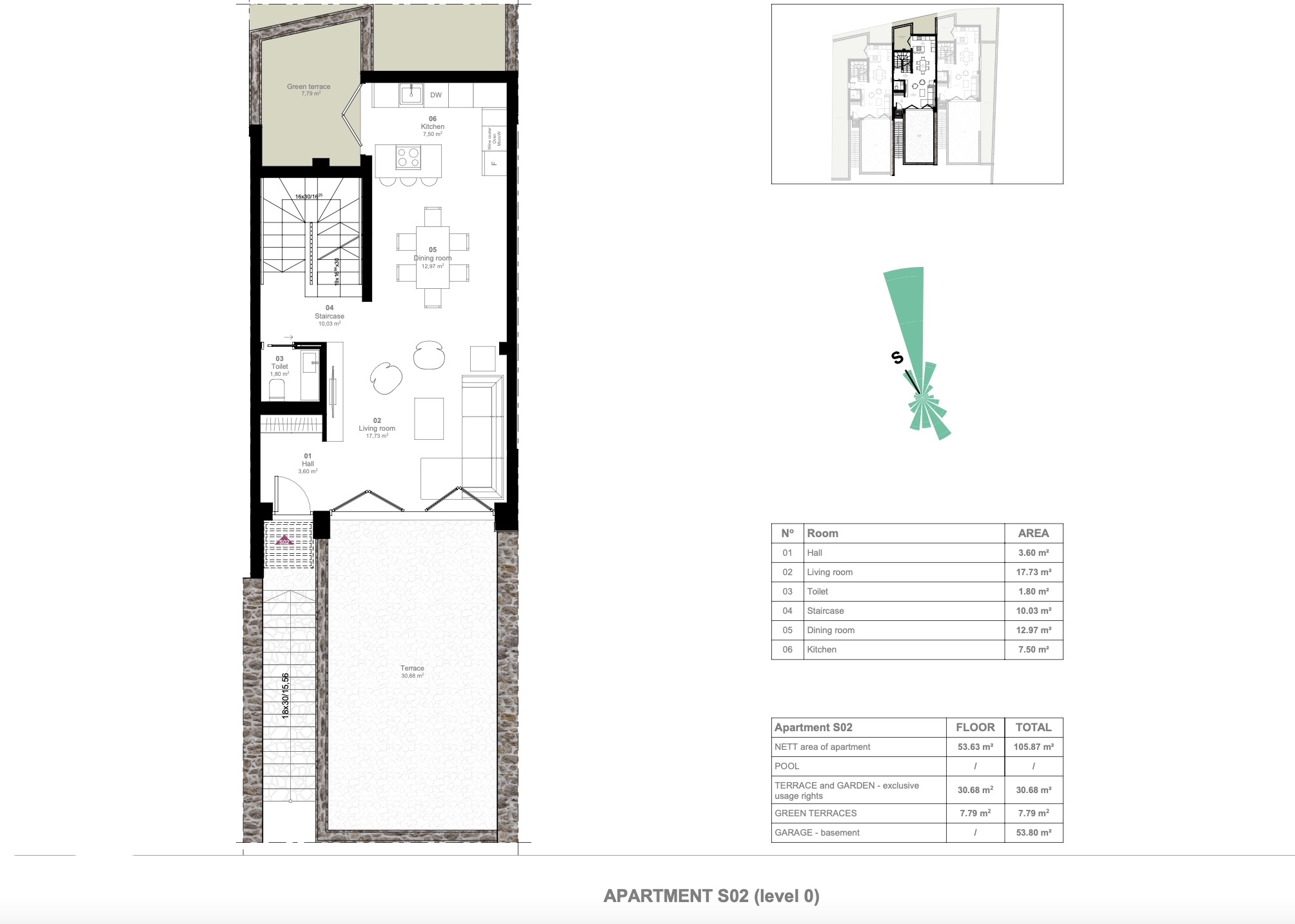 The townhouse is sold with a premium-class finish, using natural materials such as stone and wood. It is equipped with Villeroy & Boch sanitary ware and Daikin climate control system.