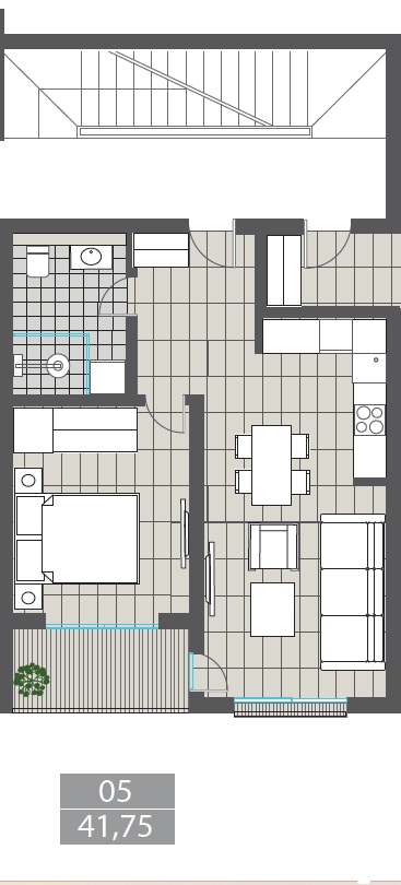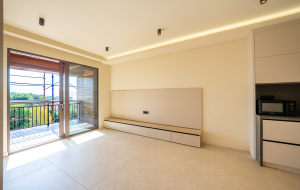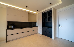 The apartment consists of a living room combined with a kitchen, a bedroom, a bathroom, and a terrace. The apartment is sold turnkey with furniture and appliances. Custom design renovations are possible. The interior finish is done using high-quality materials with natural wood and stone elements, WINDFREE Samsung air conditioners, Villeroy & Boch plumbing fixtures, Kartell LAUFEN.