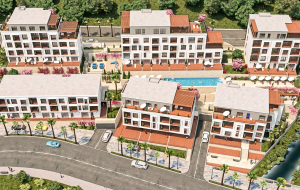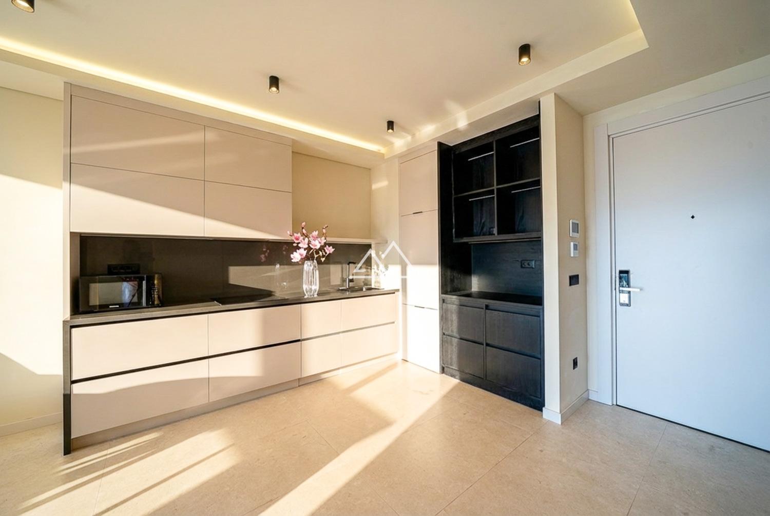The complex features a swimming pool, SPA, fitness center, underground parking, gated territory, and 24/7 concierge service. Custom interior design is possible, and the apartments are sold turnkey, fully furnished with appliances.