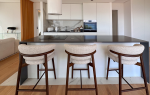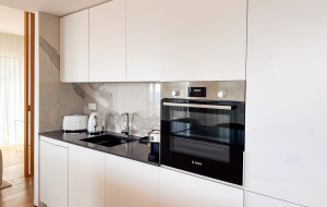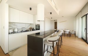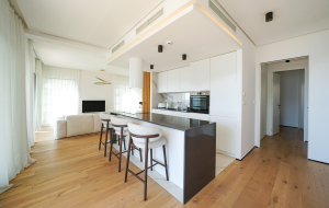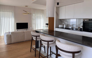 Pastel colors, stone and wood elements are used in interiors which gives the apartments additional coziness and warmth. The apartments have a smart home system, modern air conditioning, heated floors, fire alarm and security system. The apartments are sold fully finished with a built-in kitchen and sanitary ware in the bathrooms.