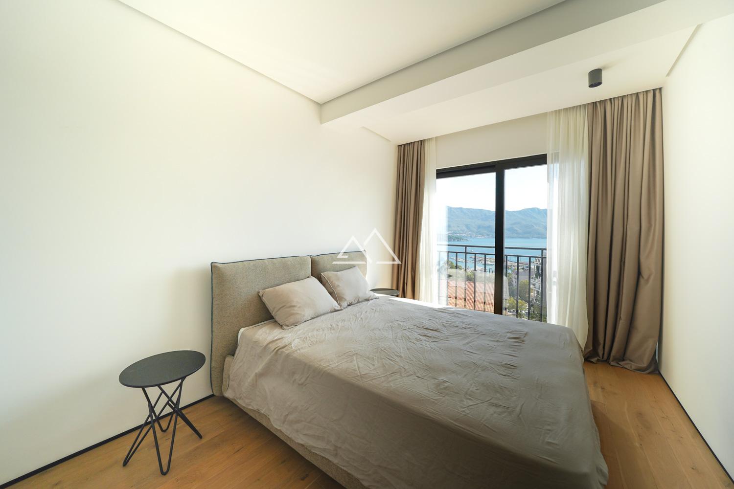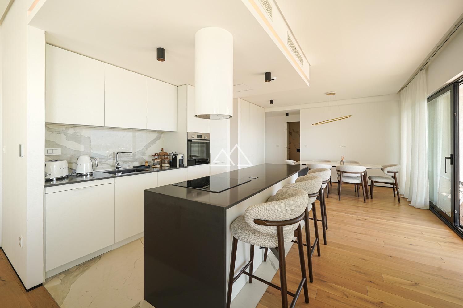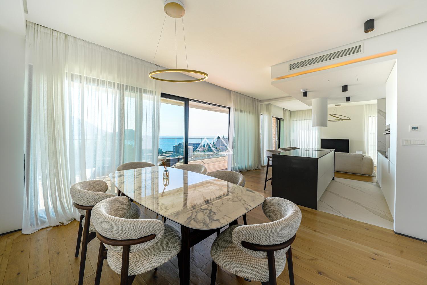 New three-bedroom apartment in a residential complex with a swimming pool in Budva. The apartment are sold with a built-in kitchen and wardrobes. The panoramic windows offer stunning views of the sea and the old town. Panoramic windows offer stunning views of the sea and the old town. The apartment is very bright, cozy, and has a convenient layout.