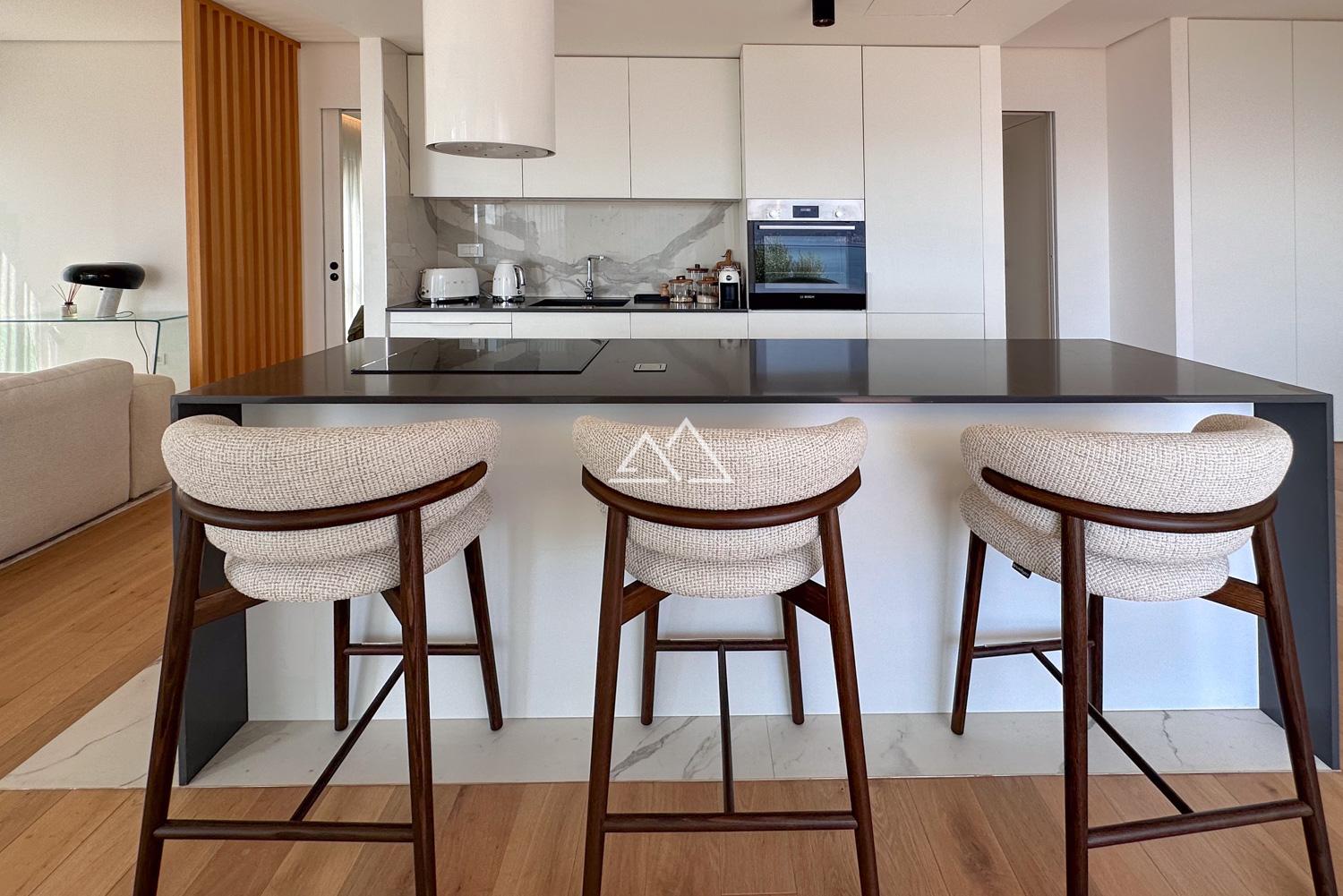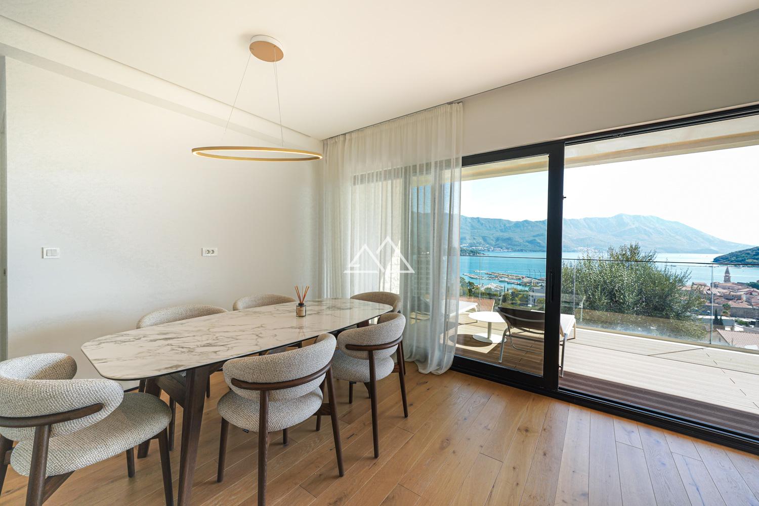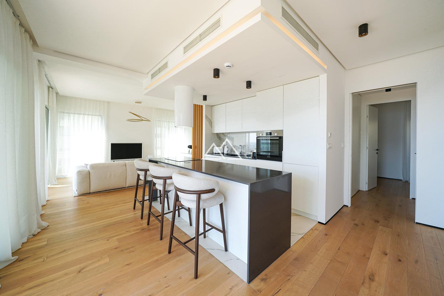 New three-bedroom apartment in a residential complex with a swimming pool in Budva. The apartment are sold with a built-in kitchen and wardrobes. The panoramic windows offer stunning views of the sea and the old town. Panoramic windows offer stunning views of the sea and the old town. The apartment is very bright, cozy, and has a convenient layout.