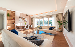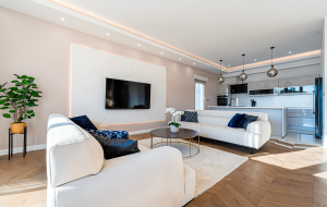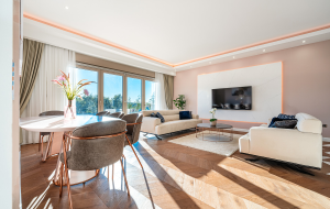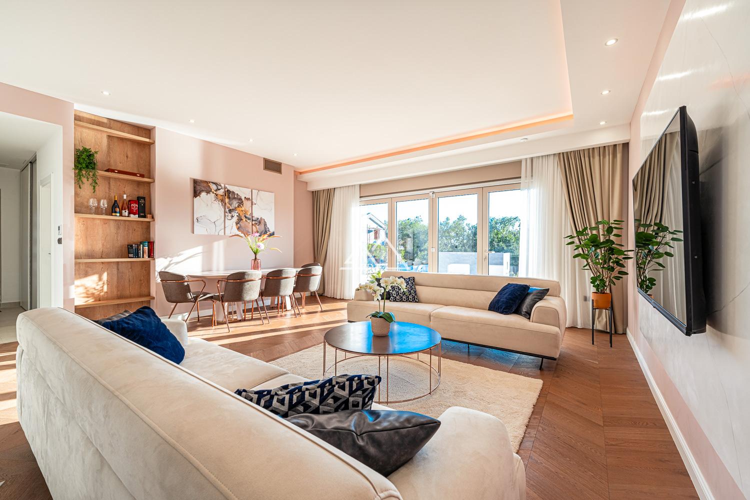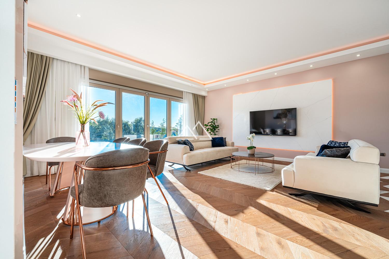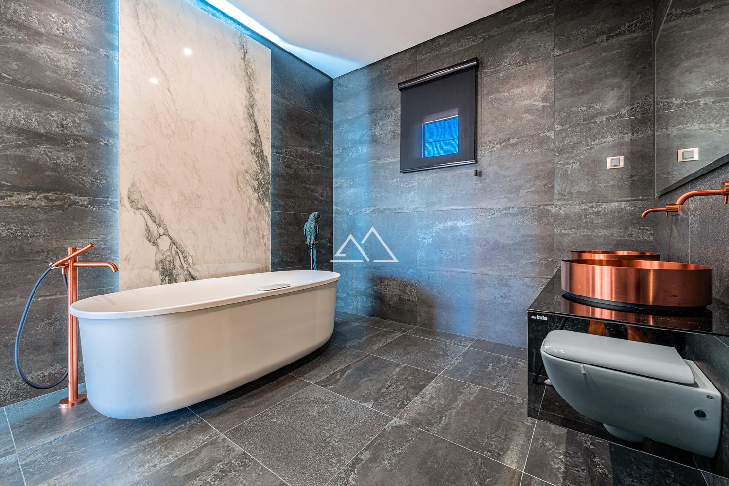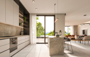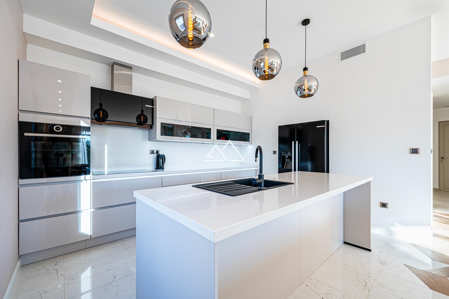 Villa is a three-storey stand-alone property. Ground floor comprises of a spacious kitchen plus a 42 sqm dining and living area which leads up to the astonishing, secluded terrace and an outdoor zero-edge pool with a lovely garden area with aromatic Mediterranean plants. In addition to it, villa features a guest toilet and technical room on the ground floor.