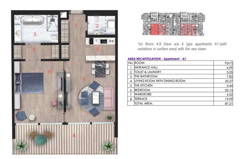 One bedroom apartment with panoramic sea views. The apartment of 87 m2 is located in a new, luxurious 5 star hotel, located 10 meters from the sea.