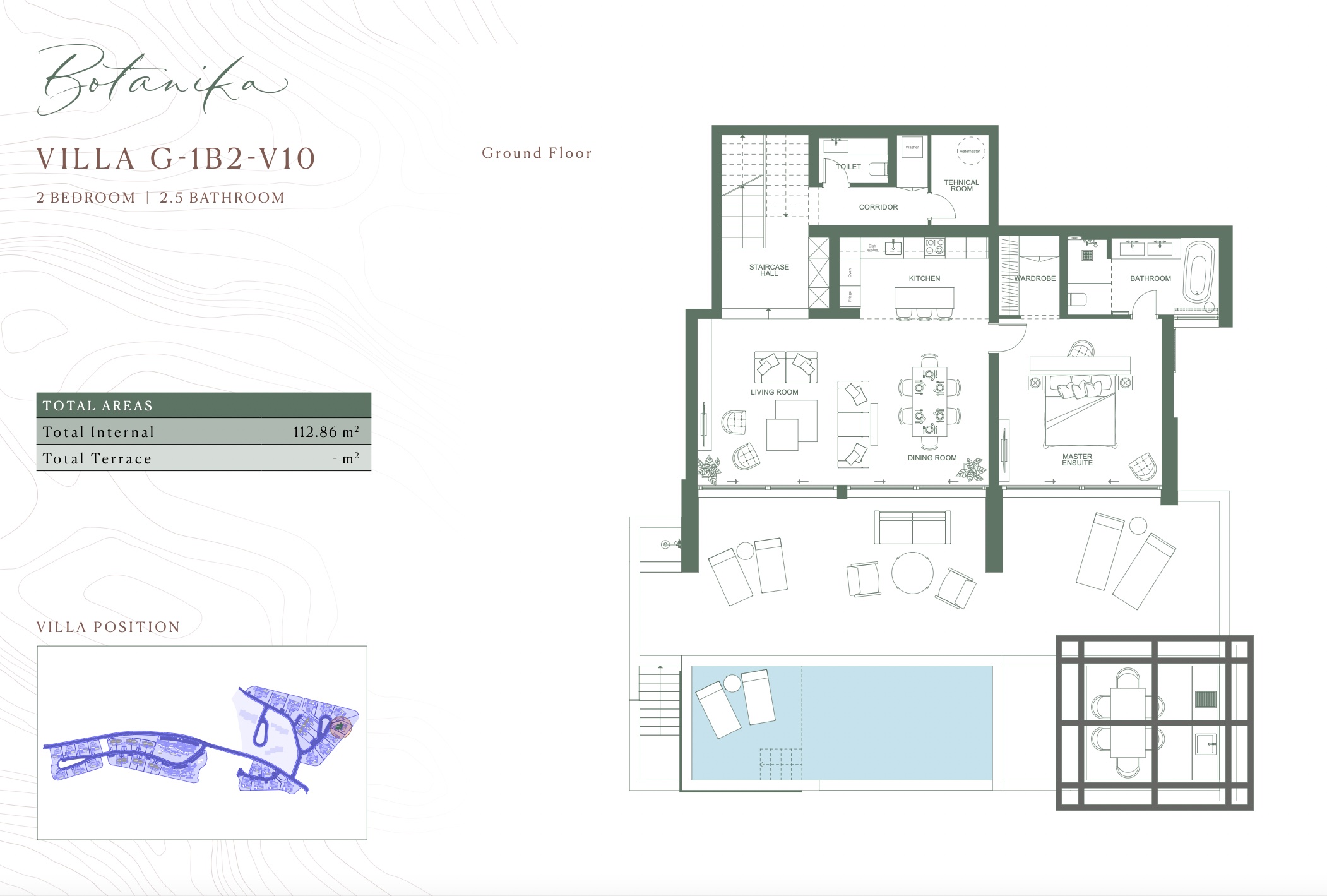 This villa has a total area of 252,86 square meters and features 2 bedrooms and a pool with breathtaking sea view.
