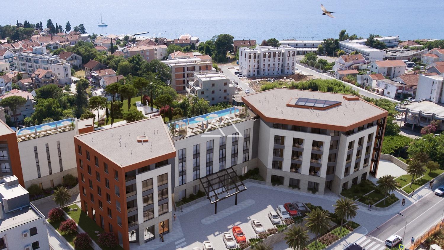 3-bedroom apartments in a high-class complex under construction in a new neighborhood of Tivat. The building was designed according to world standards for 5* hotels. The complex will consist of two detached buildings. Each building is equipped with a recreation area and a rooftop pool. There is an underground parking for 104 cars, a gym and a SPA center.