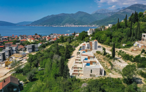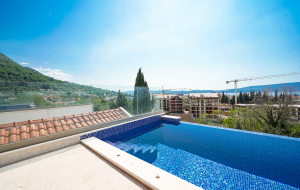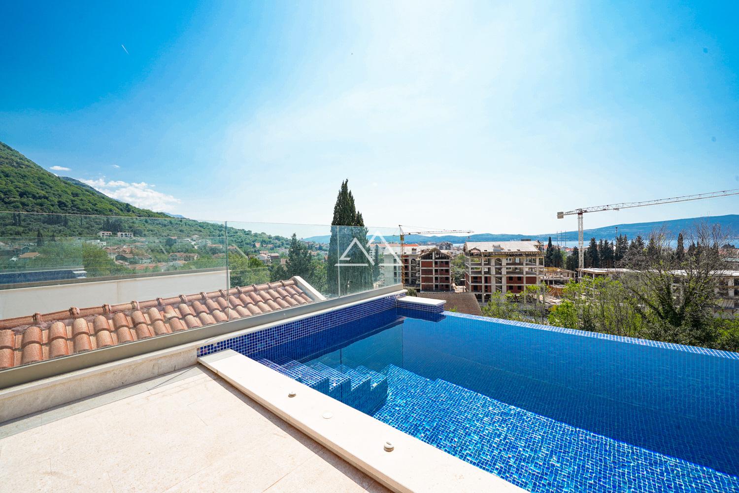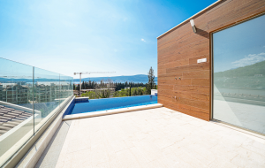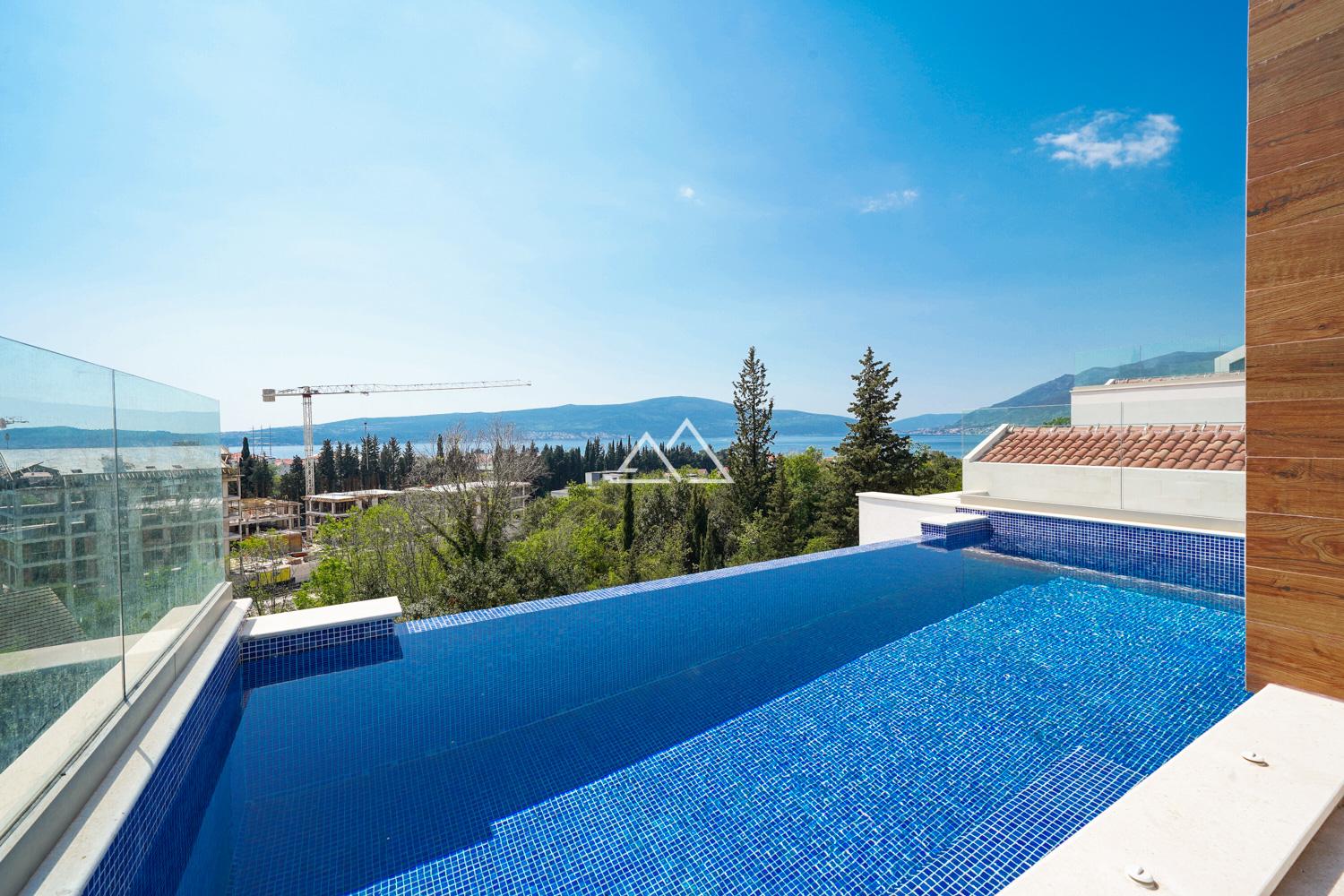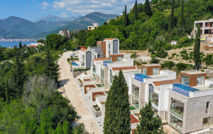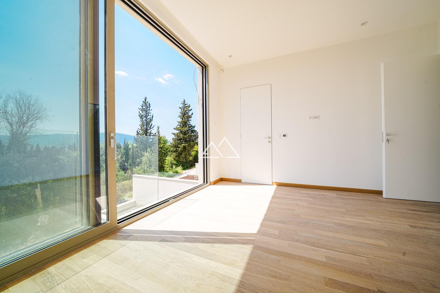 Ready-to-move-in townhouse (К-1) with 2 bedrooms with a swimming pool and a 2-car garage in a new premium-class complex in Tivat. The complex is situated on a small elevation surrounded by greenery, close to all city infrastructure. The distance to the sea is 400 meters. Panoramic windows offer breathtaking views of the sea, mountains, Tivat, and Porto-Montenegro. The project's distinctive features include walk-in closets and storage rooms, as well as a private garage.