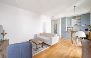 The apartment is located on the 3rd floor of a four-story low-rise building. Apartment area is 67 m2. The apartment consists of a spacious living room with kitchen and dining area, two bedrooms, two bathrooms, and a spacious terrace. The apartment is fully furnished with high-quality furniture and equipped with household appliances, ready to move in.
