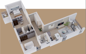 The apartment consists of a hallway, a living room combined with a kitchen, two bedrooms, two bathrooms, and a terrace. The apartment is sold with a finished interior and built-in plumbing.
