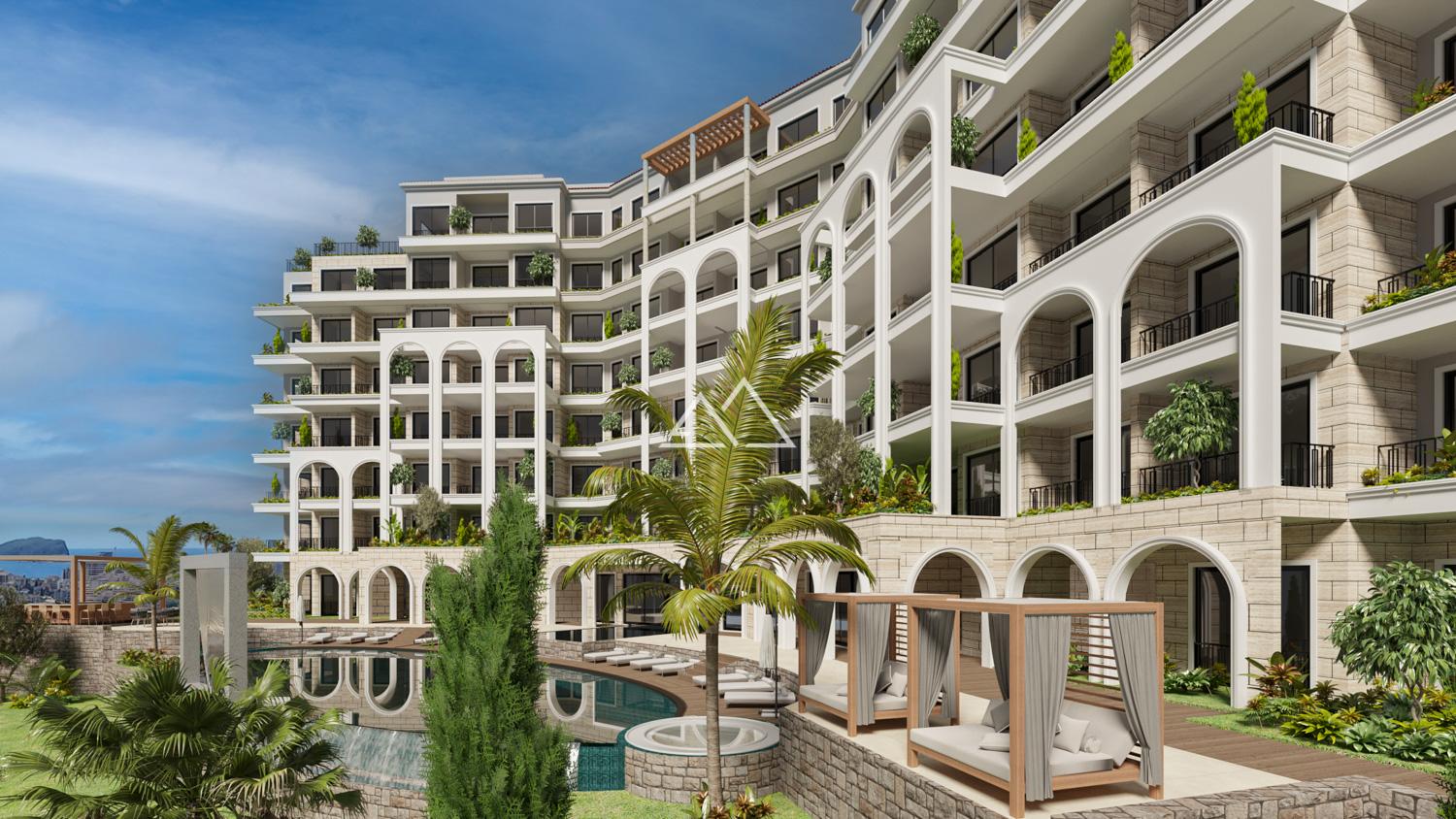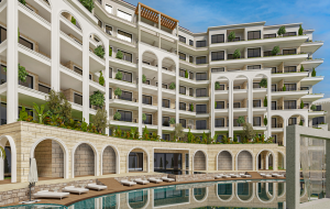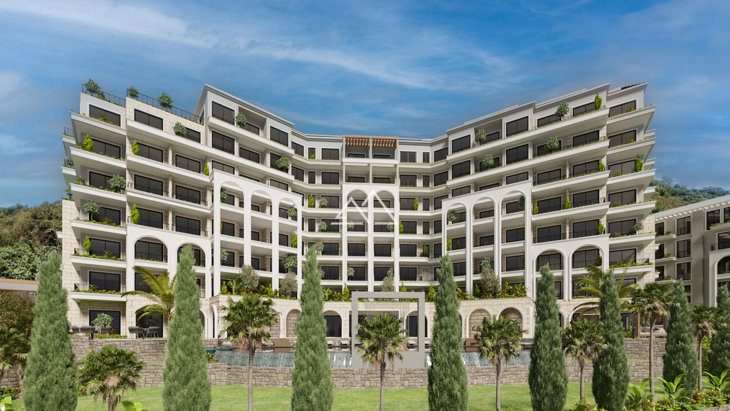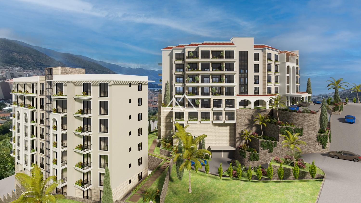 A new premium-class residential complex in Budva. The complex is located within the city, on a picturesque hill. This location offers residents convenient and easy access to Budva's extensive infrastructure (within a 200-meter radius, you'll find shops, restaurants, cafes, schools, and medical facilities), while a pleasant walk to Budva's pristine beaches takes only 8-10 minutes.