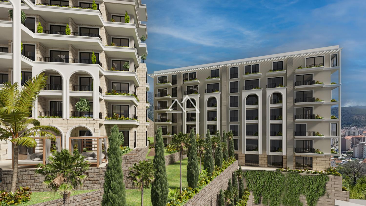 1-bedroom apartment in a new premium-class residential complex in Budva. The complex is located within the city, on a picturesque hill. This location offers residents convenient and easy access to Budva's extensive infrastructure (within a 200-meter radius, you'll find shops, restaurants, cafes, schools, and medical facilities), while a pleasant walk to Budva's pristine beaches takes only 8-10 minutes.