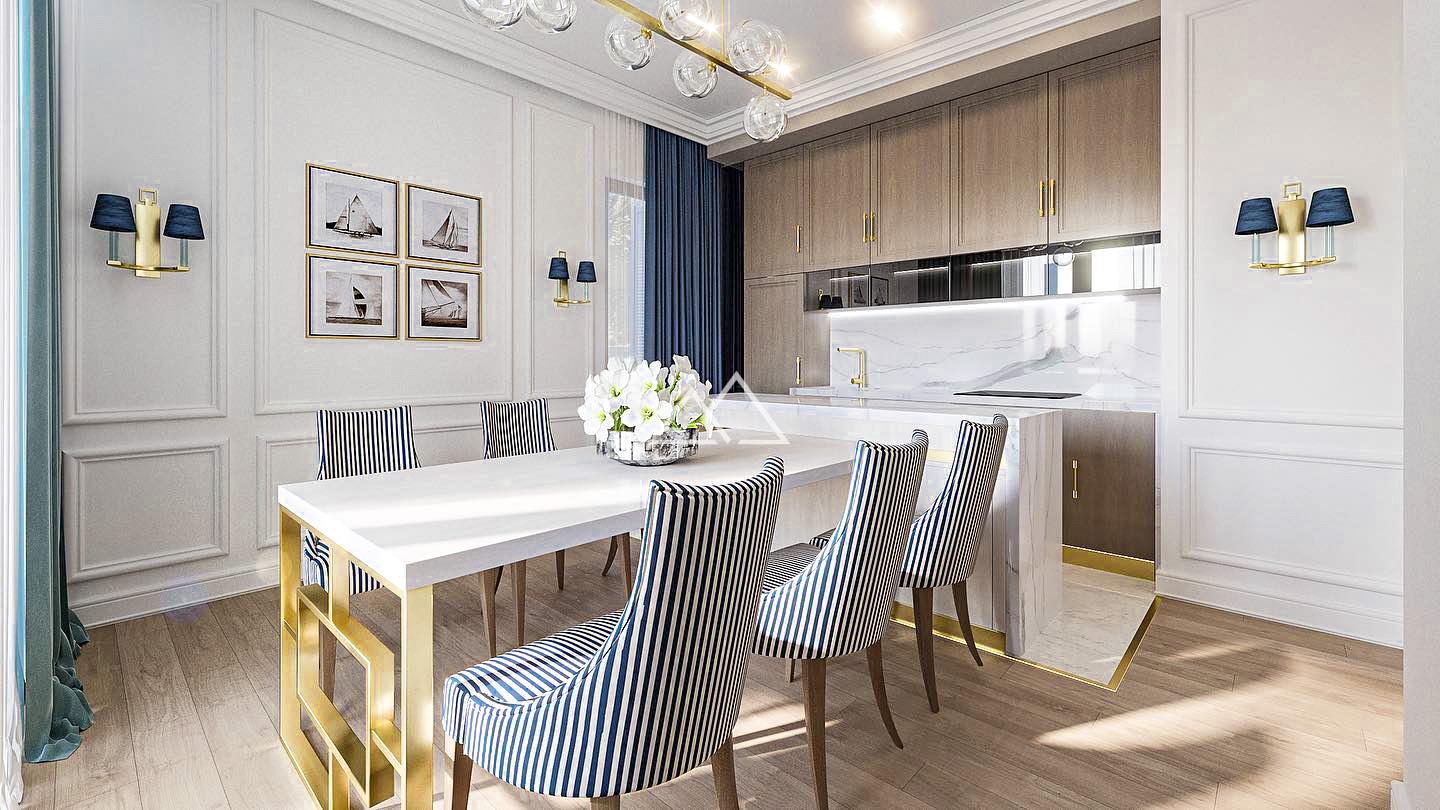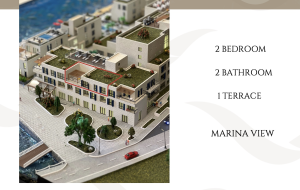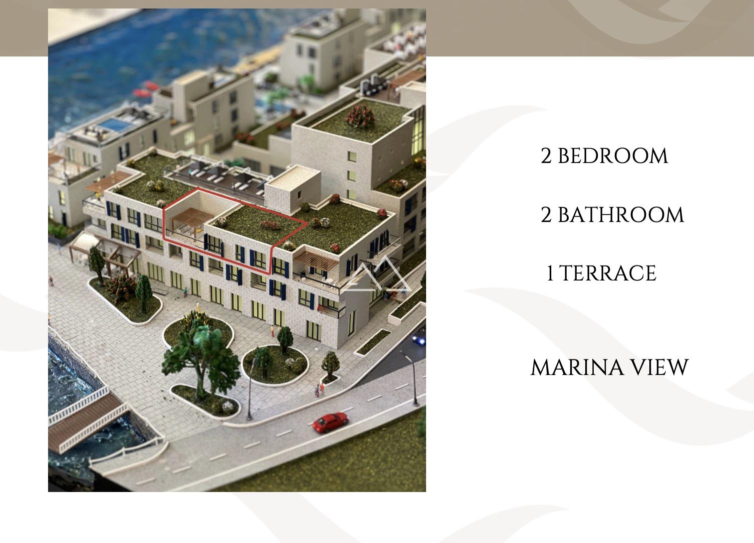 The apartment is located on the top (third) floor and consists of a hallway, a living room combined with a kitchen and dining area, leading to a spacious, private terrace (40 m²), two bedrooms, and two bathrooms. The panoramic windows offer magnificent views of the sea and marina. The apartment is sold with premium finishes and high-end furniture.
