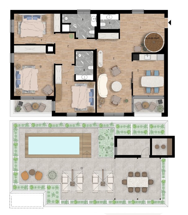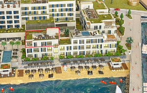The penthouse has a total area of 288.32 m². It consists of a spacious living room combined with a kitchen and dining area, three bedrooms, two bathrooms, and a guest toilet. The owners also have access to two balconies, as well as a private terrace measuring 110.10 m², featuring a green area of 43.82 m² and a private pool of 10.77 m², offering breathtaking views of the sea and coastline.