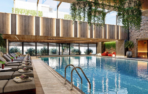 • Spa and fitness center with an indoor infinity pool, gym, yoga area, vitamin bar, and delicatessen counter