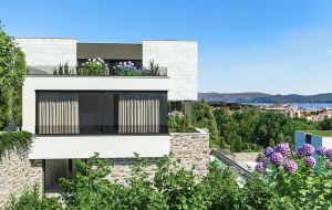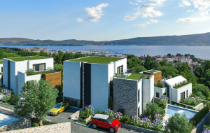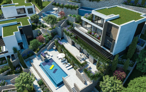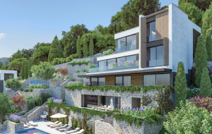 The complex is situated on a small elevation, surrounded by greenery, just 400 meters from the sea, and within walking distance of urban infrastructure. Floor-to-ceiling windows offer breathtaking views of the Adriatic Sea, picturesque mountains, and the renowned Porto Montenegro—a prestigious yachting hub and luxury destination.