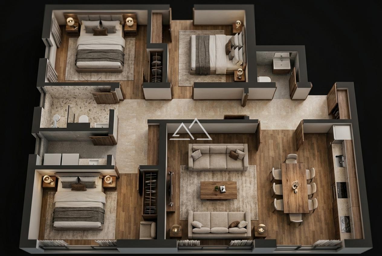 The apartment is sold with high-quality finishing and built-in sanitary ware.