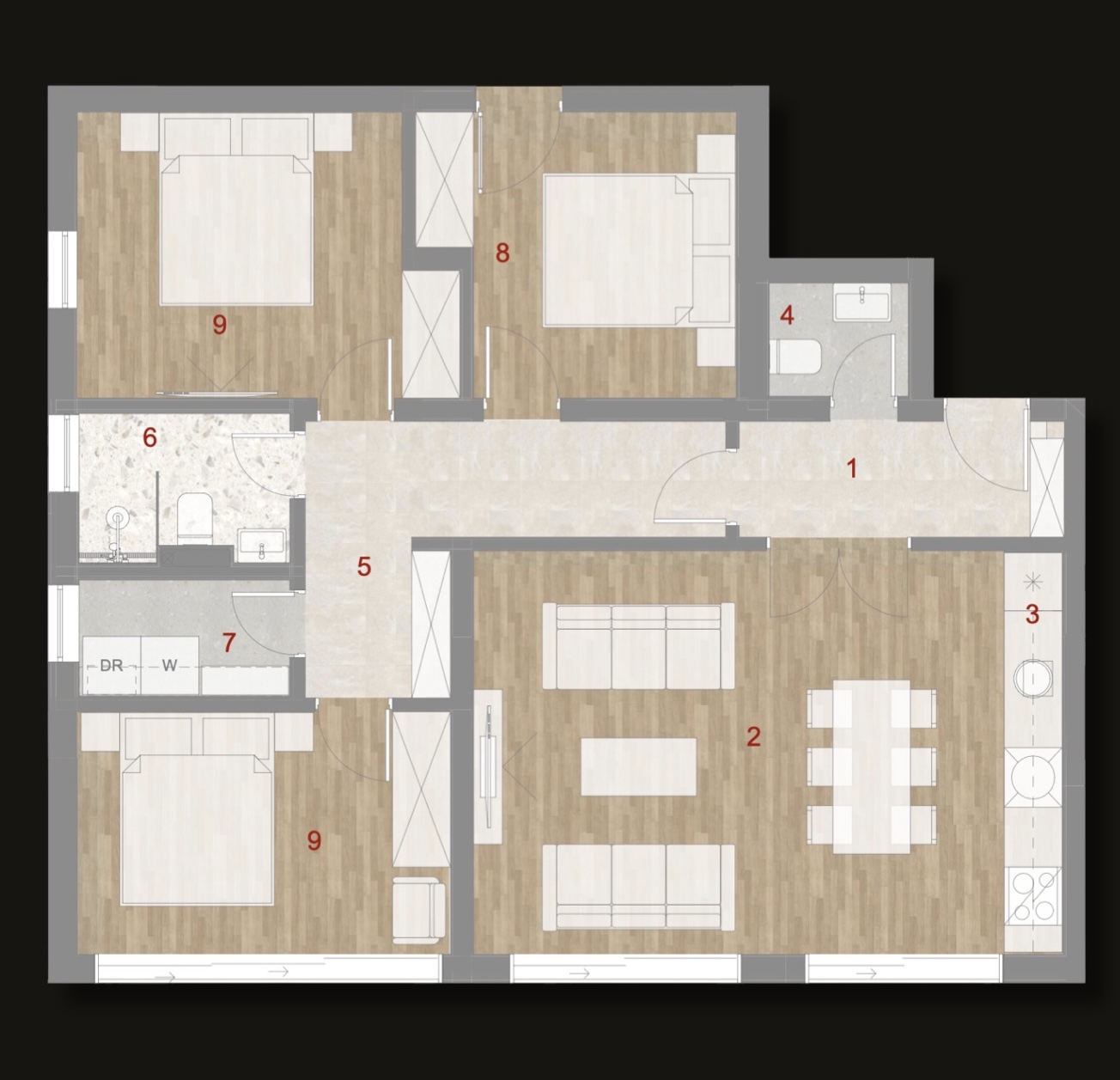 • three bedrooms