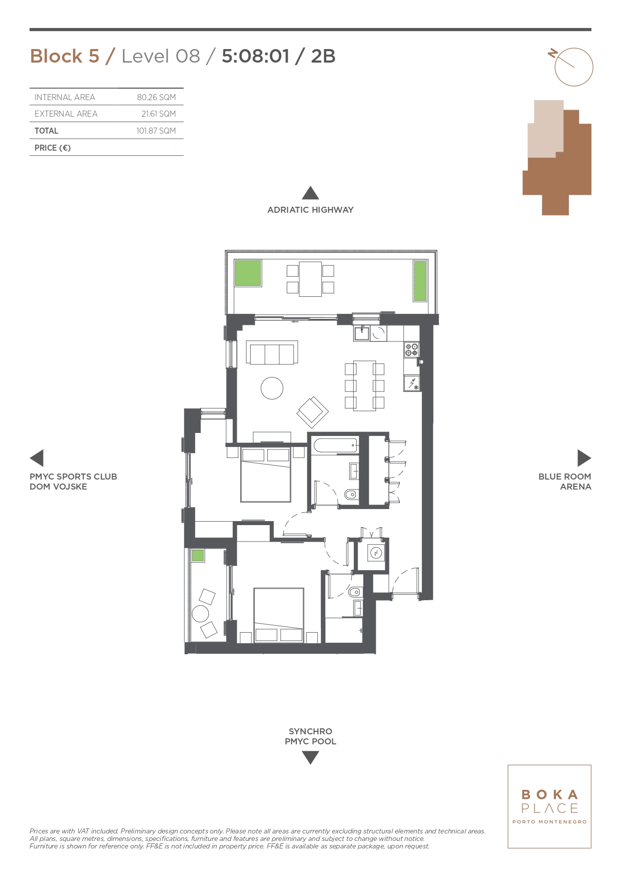 Boka Place is situated in the heart of Tivat. This new district within Porto Montenegro is designed with a focus on urban infrastructure and a healthy lifestyle. The complex features a variety of shops, cafés, a fitness center, a spa, a cinema, and relaxation areas. Buyers of apartments in this new residential development will have a rare opportunity to become part of Porto Montenegro’s unique international community and enjoy numerous exclusive benefits.