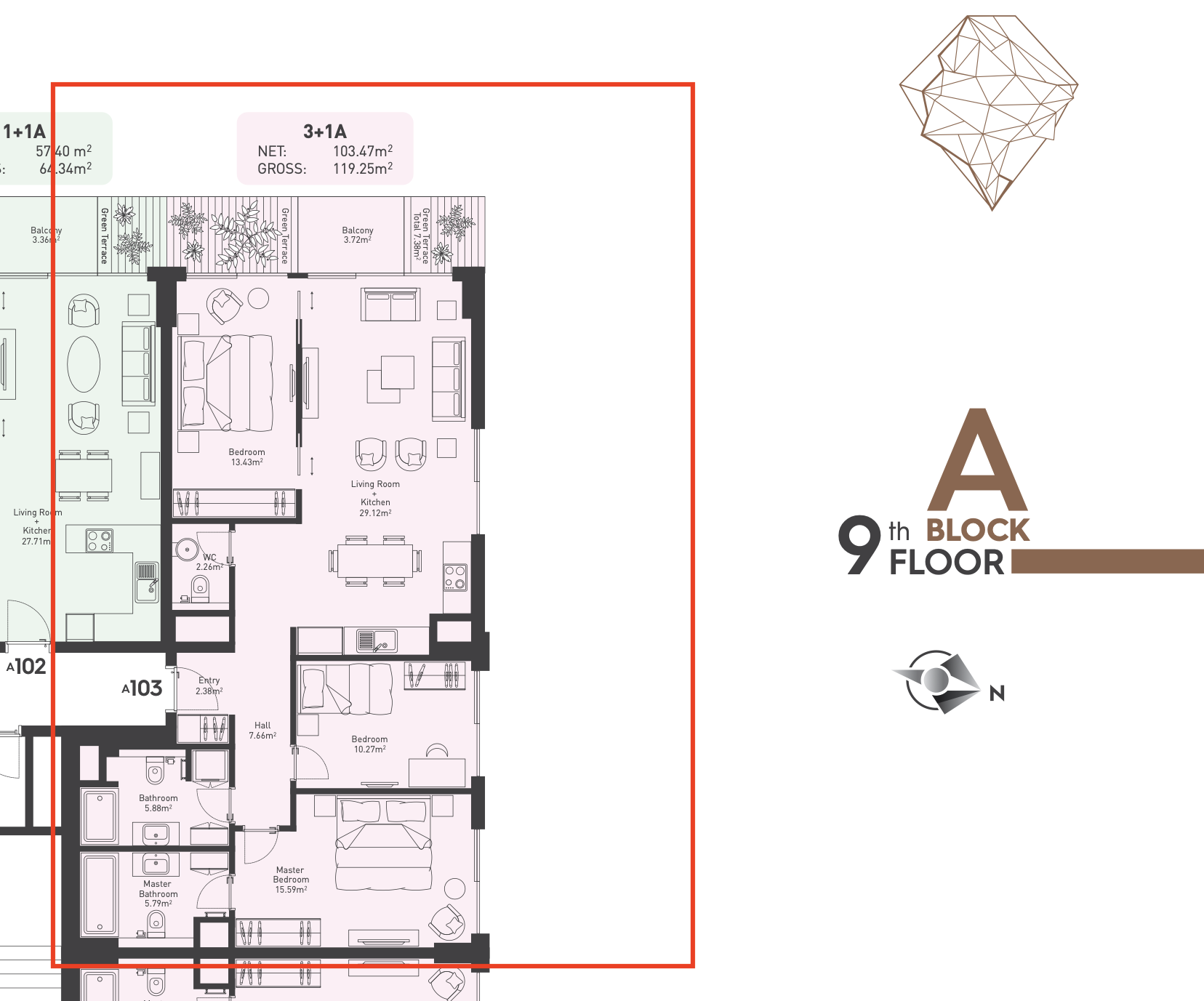 The apartment is located on the 9th floor and consists of an entrance hall, guest bathroom, living room combined with a kitchen with access to the terrace, three bedrooms, and two bathrooms.