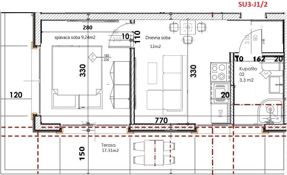 - Layout: 1 bedroom, open-plan living and dining area, kitchen, bathroom, and terrace with sea view
